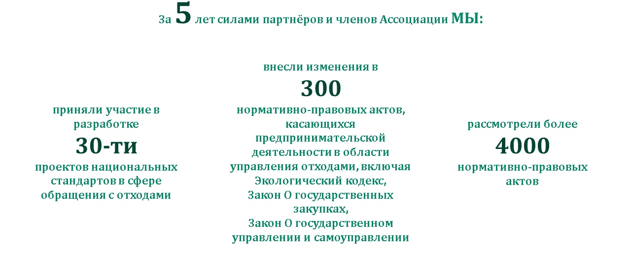 Пять лет – это немного. Но мы можем уверенно сказать: каждый день на протяжении этих пяти лет мы работаем для развития отрасли по управлению отходами, заботимся об окружающей среде, сотрудничаем с общественностью и лицами, принимающими решения, по решению проблем, связанных с отходами.